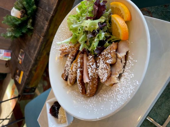 Belle Cristo: Two thick slices of our rich and sweet Crème Brulée French toast, stuffed with hot thinly sliced turkey and melted Muenster cheese, sprinkled with powdered sugar, and served with a side of jam, dijonnaise and a salad of fresh baby greens tossed in a seasonal fruit vinaigrette.